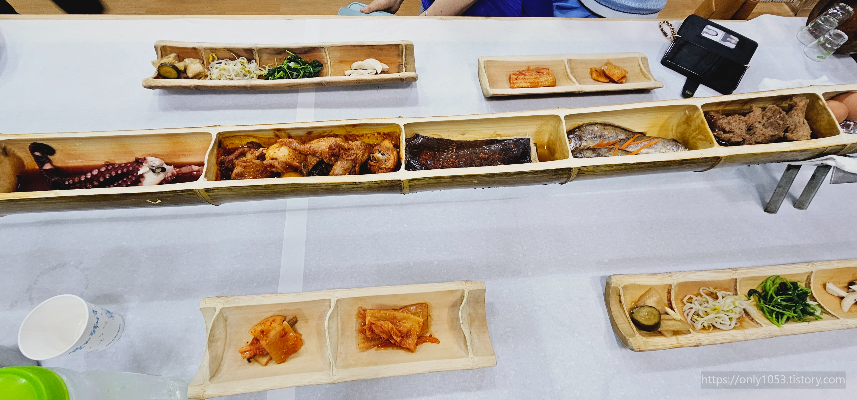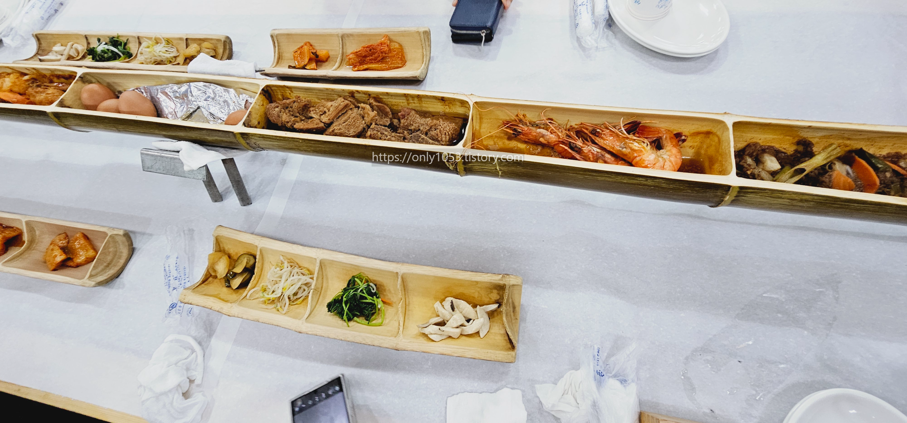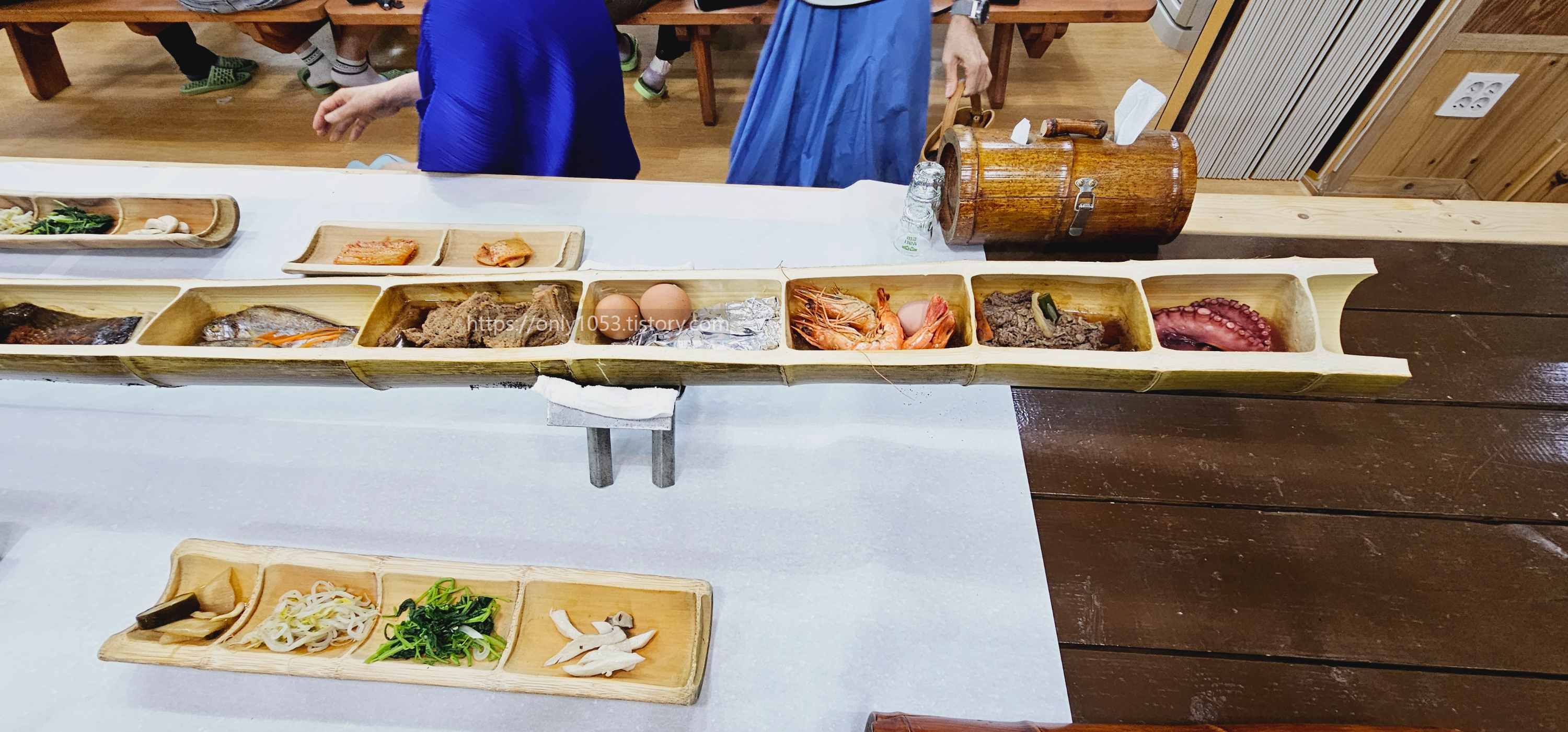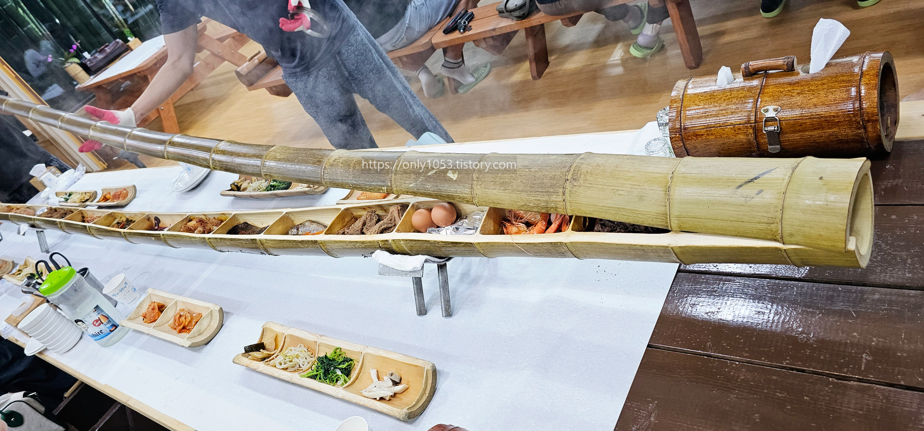 대나무를 반으로 잘라 음식재료를 넣고 통으로 넣어서 굽는다고 합니다.